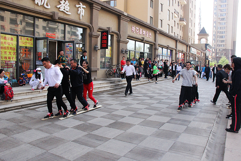 “齊心協(xié)力”項目比的就是大家的一致性,各代表隊派出二組選手,每組四名運動員,分別站在兩塊木板上,用繩固定腳與木板,雙手扶肩,從起點向終點出發(fā),在終點線交接后,下一組返回。萬豪酒店以絕對的優(yōu)勢取得第一名。