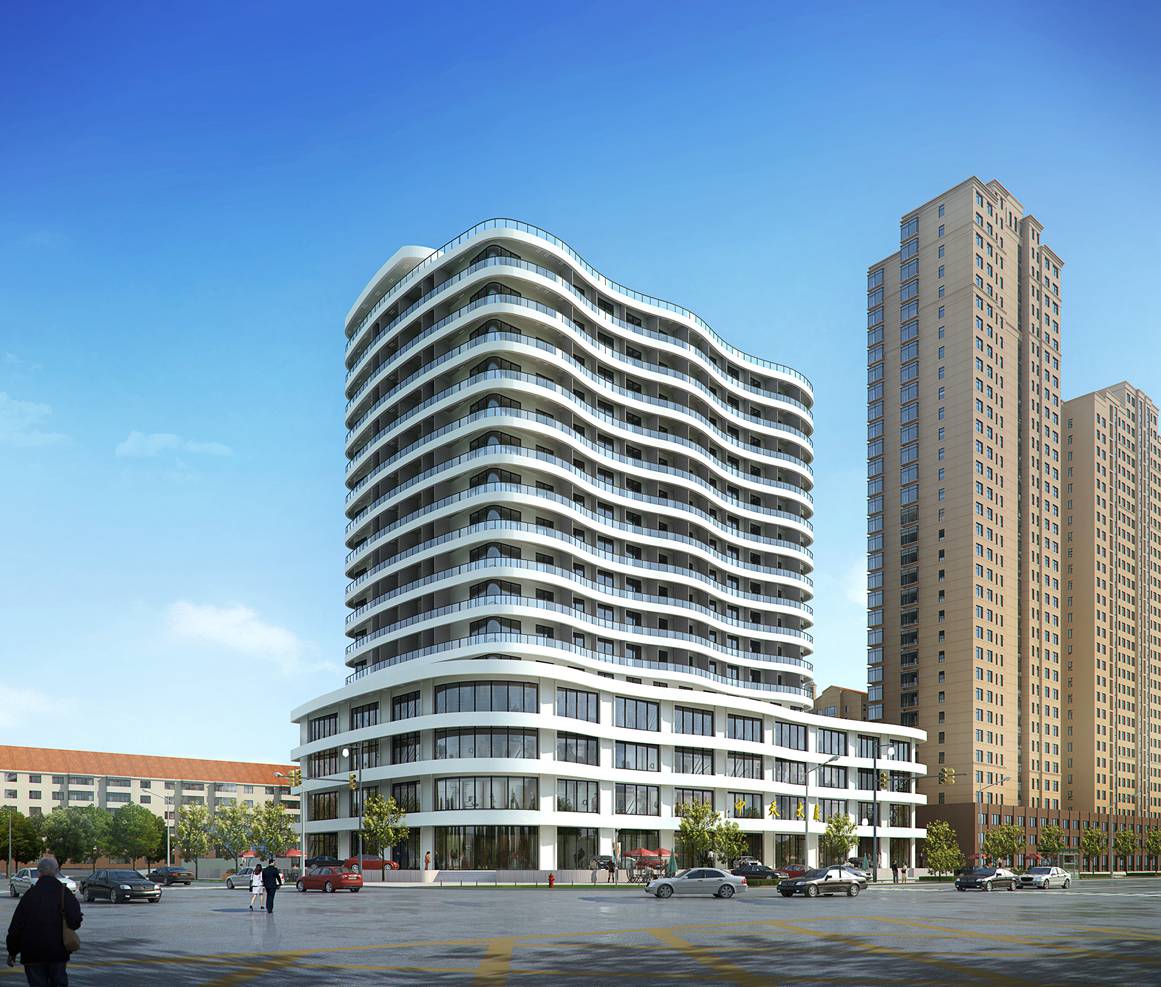 在建筑表現(xiàn)形式上,采用現(xiàn)代建筑風格,建筑立面結(jié)合營口作為海濱城市特點,利用框架剪力墻結(jié)構(gòu)的支撐,每一層都包裹上鋼筋混凝土懸臂弧形陽臺,借用曲邊陽臺前后進出起伏的變化,營造出近似水紋波浪的建筑表現(xiàn)。采用高檔外墻飾面層,通過精雕細刻的施工工藝,呈現(xiàn)出精致美觀的城市建筑,完善城市的天際線,豐富城市的建筑街景。