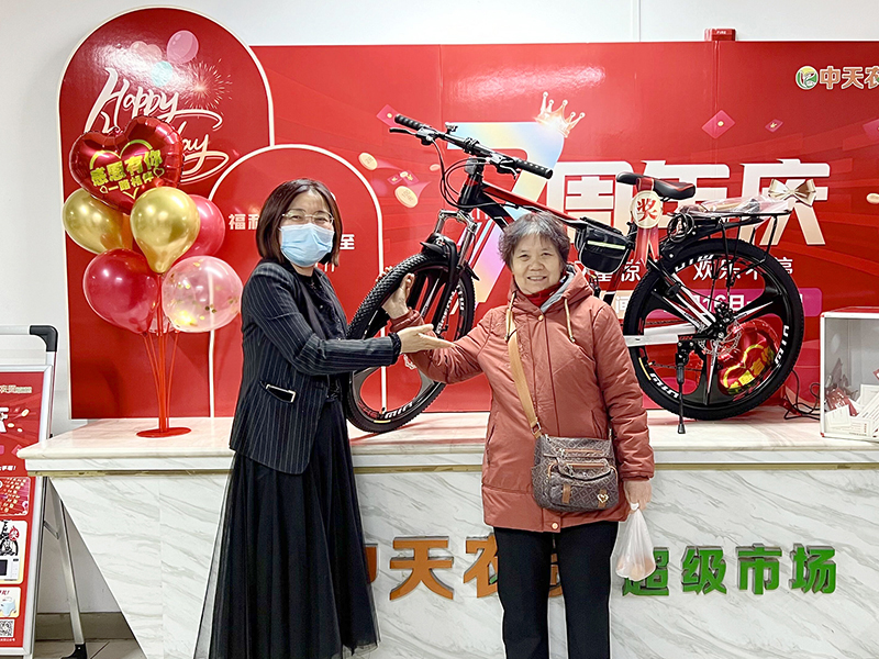 同時(shí)為感謝廣大顧客七年以來(lái)對(duì)中天農(nóng)貿(mào)的支持與厚愛(ài),市場(chǎng)在慶典當(dāng)天投放了千枚鮮雞蛋,免費(fèi)領(lǐng),共慶生,傾情回饋七年的相伴,最后的重頭戲,是最令人期待的大抽獎(jiǎng)環(huán)節(jié),本次慶典活動(dòng)獎(jiǎng)品除了微波爐、電烤箱、料理機(jī)、電熱鍋等小家電以外,還特別增設(shè)了特等獎(jiǎng)——品牌變速山地車(chē),面對(duì)豐厚的獎(jiǎng)品,熱情的顧客們都已按捺不住激動(dòng)的心情,迫不及待的想知道自己是不是幸運(yùn)兒,隨著主持人念出幸運(yùn)號(hào)碼,現(xiàn)場(chǎng)一片笑語(yǔ)歡聲,開(kāi)獎(jiǎng)結(jié)束后,農(nóng)商公司總經(jīng)理孫晶為中獎(jiǎng)?lì)櫩皖C獎(jiǎng)并合影留念。