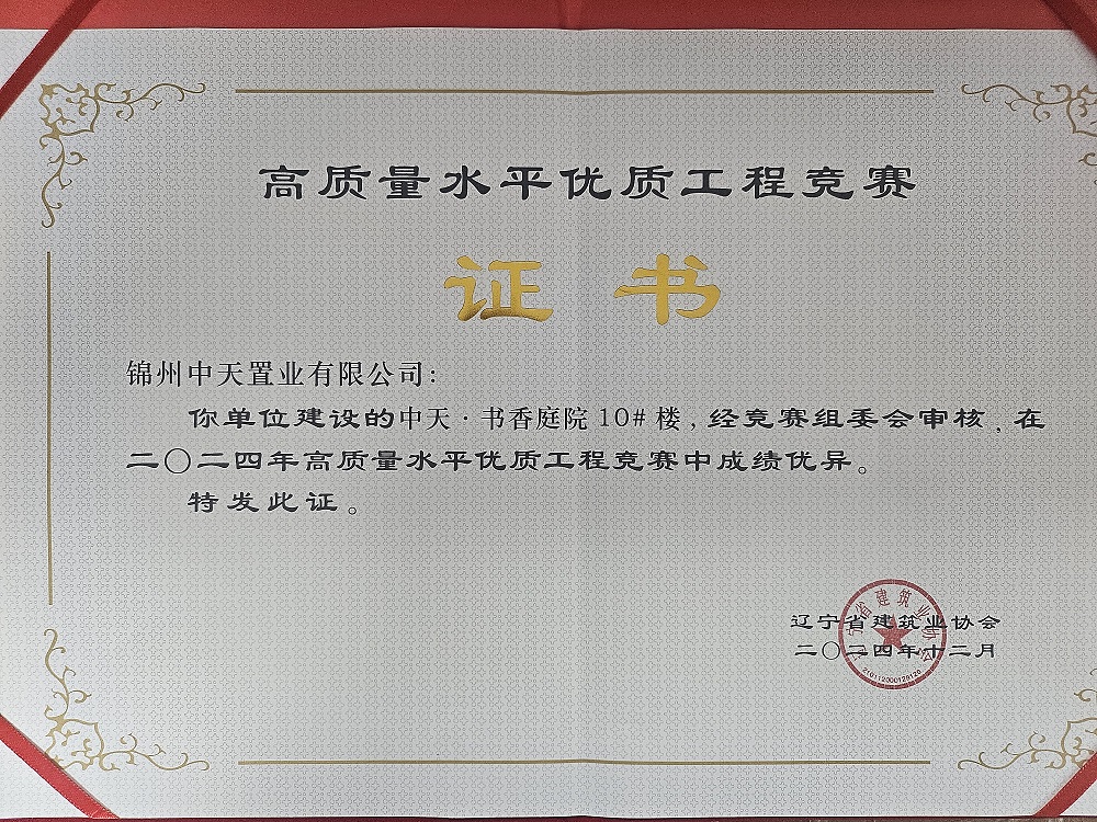 2024年12月,錦州中天·書(shū)香庭院一期項(xiàng)目6棟樓獲得省高質(zhì)量水平優(yōu)質(zhì)工程競(jìng)賽獎(jiǎng),這樣一個(gè)振奮人心的消息,是對(duì)中天·書(shū)香庭院項(xiàng)目建設(shè)最好的肯定,同時(shí)也是對(duì)工程人無(wú)私付出的最好回報(bào)。遼寧省建筑業(yè)協(xié)會(huì)舉辦的高質(zhì)量水平優(yōu)質(zhì)工程競(jìng)賽代表著建筑施工質(zhì)量管理的領(lǐng)先水平,彰顯了中天在工程項(xiàng)目管理、工程品質(zhì)、技術(shù)創(chuàng)新等領(lǐng)域的卓越實(shí)力。