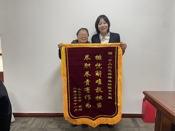 11月29日,中天桃花源小區(qū)15號樓3單元2-11樓業(yè)主捧著”排憂解難敢擔當,盡職盡責有作為”的錦旗來到物業(yè)辦公室,感謝中天桃花源物業(yè)經理富志剛及物業(yè)全體員工給予高度的認可。此前業(yè)主家突發(fā)水管破裂,物業(yè)經理接到通知后,迅速聯(lián)系管家召集隊伍前往水管破裂現(xiàn)場,到達現(xiàn)場后仔細查看破裂口,物業(yè)經理富志剛指揮有序,在與漏水口爭分奪秒,及時搶修,避免了損失擴大,后續(xù)由保潔清理滿是水漬的地面,也保障了業(yè)主正常用水及進出安全。業(yè)主家老人兒女經常不在身邊,作為物業(yè)經理總能為老人家排憂解難,遇到問題,都非常耐心的給老人家處理解決,無論是設施故障還是生活中的瑣事,物業(yè)經理富志剛總能第一時間響應,以高效務實的態(tài)度全力解決。從每一個細節(jié)都彰顯著物業(yè)經理的責任與擔當,同時也讓業(yè)主對中天桃花源物業(yè)全體員工的辛勤的付出和努力工作加以肯定,讓業(yè)主倍感安心與溫暖,因此用一面錦旗表達最誠摯的謝意。